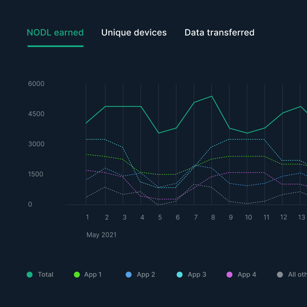 A Nodle Connect-to-Earn alkalmazása NODL tokenekkel - a Nodle natív kriptovalutájával - jutalmaz meg, ha okostelefonod csatlakoztatod és táplálod a hálózatot. Ez egy segédprogram és irányítási token, amelyet a Nodle Blokklánc oszt ki a Nodle Hálózat résztvevőinek.